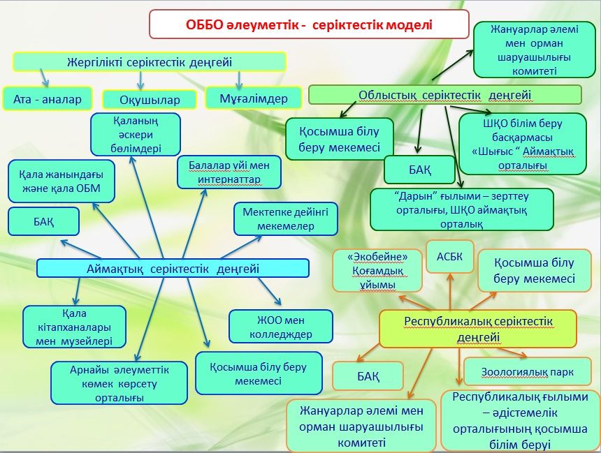 Облыстық балалар биологиялық орталығында ғылыми – педагогикалық жүйе ашылып, қаланың барлық білім беру мекемелерімен, облыстық, қоғамдық мекемелермен, тәрбиеленушілер отбасымен тығыз қарым – қатынас жолға қойылды. Әлеуметтік – серіктестік орталығы, сонымен қатар келісім- шартқа отырып, қалалық және аймақтық конкурстарды, экологиялық акциялдарды, көптеген тәрбие мерекелерін, экспедиция жүргізуді, тәжірибелік – тұспалдау семинарлары, экологиялық форумдар, көрмелер және т.б. іс – шараларды жүзеге асырады.