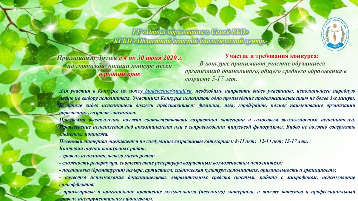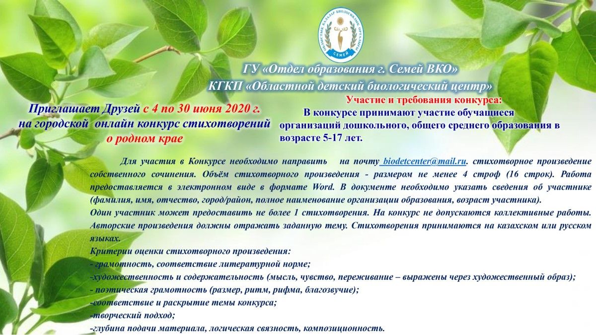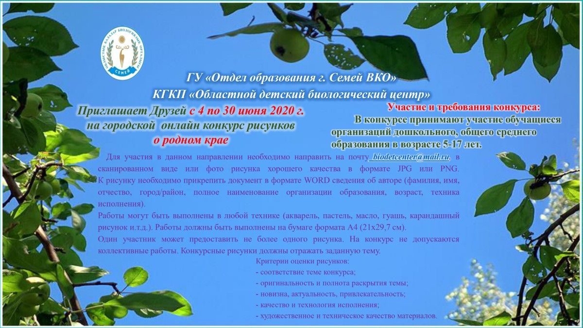ГУ «Отдел образования г. Семей ВКО» КГКП «Областной детский биологический центр» приглашает Друзей с 4 по 30 июня 2020 г. на онлайн конкурсы о родном крае. Для участия направляйте конкурсные материалы на почту biodetcenter@mail.ru.