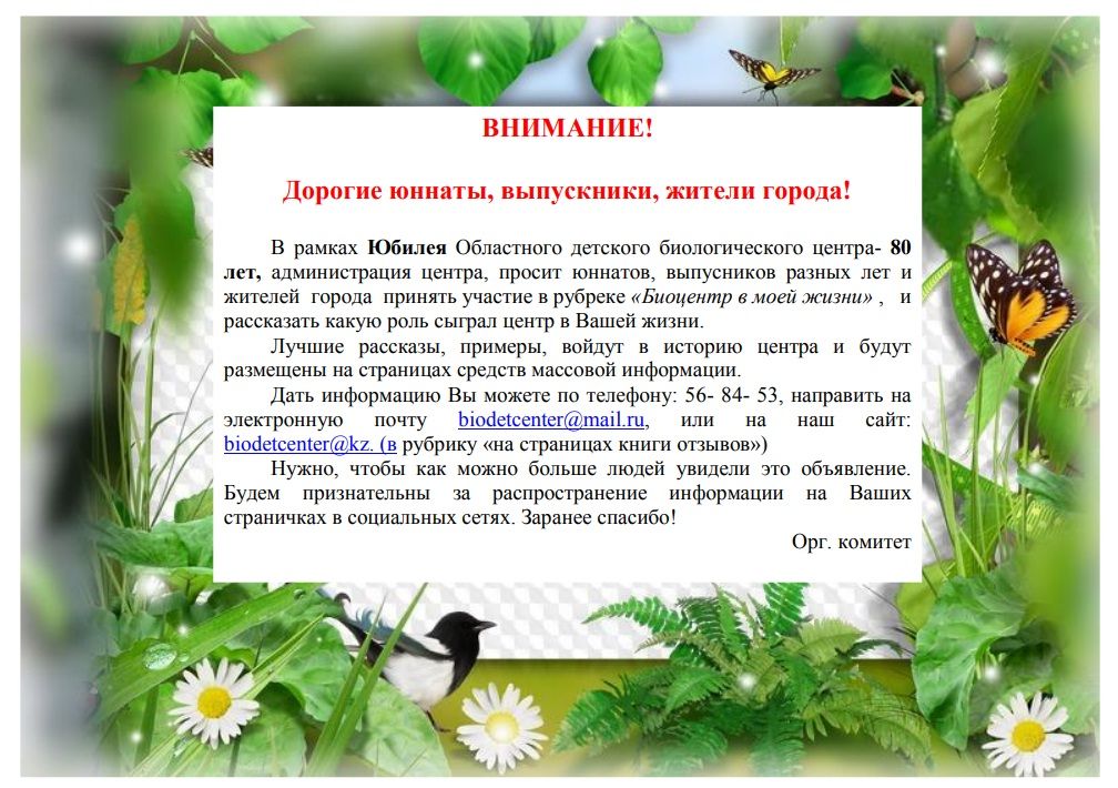 В рамках Юбилея Областного детского биологического центра- 80 лет, администрация центра, просит юннатов, выпусников разных лет и жителей  города  принять участие в рубреке «Биоцентр в моей жизни» ,   и рассказать какую роль сыграл центр в Вашей жизни.