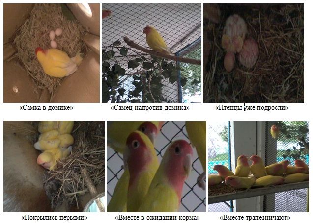 Когда птенцы подросли и начали покрываться опереньем, самка начала вылетать из домика и трапезничать со всеми во время кормления. Самец подлетал, садился рядом и как бы «переговаривался» со своей партнершей.
