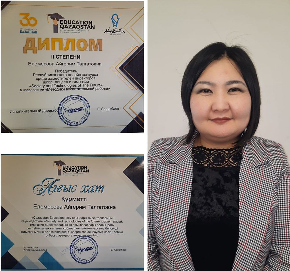 Елемесова Айгерим Талгатовна — заместитель директора по учебно – воспитательной работе областного детского биологического центра стала победителем в Республиканском онлайн – конкурсе научных проектов среди заместителей директоров школ, лицеев, гимназий «Society and technologies of the future — 2021» в направлении «Методики воспитательной работы». Поздравляем!