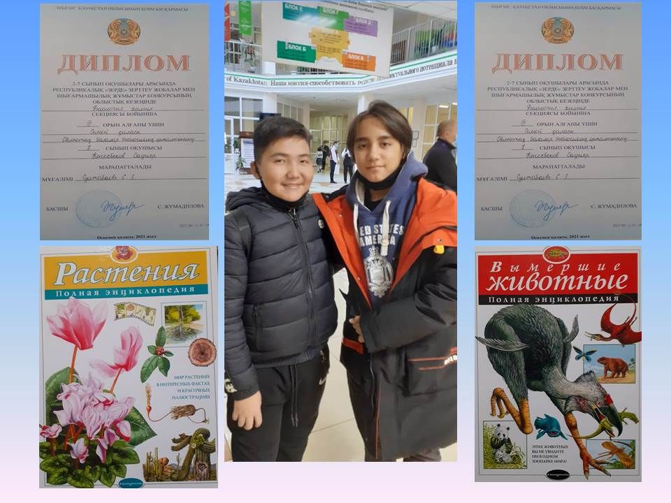 4-5 ноября 2021 года был проведен областной этап республиканского конкурса исследовательских работ и творческих проектов «Зерде» среди учащихся 2-7 классов в г. Усть – Каменогорске, где юннаты кружка «Я — исследователь» Кенесбеков Садияр и Шамсутдинов Руслан руководитель Султабаева Сулушаш Зедаевна с работой: «Особенности размножения цихлозомы чернополосой из икринок в инкубаторе» заняли 3 место и были награждены дипломами и познавательными энциклопедиями.
