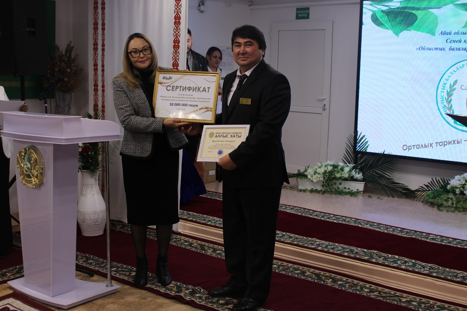 Аким области Абай Уранхаев Н.Т. вручил коллективу биологического центра подарочный Сертификат на сумму 10 000 000 тенге на улучшение материально – технической базы.
