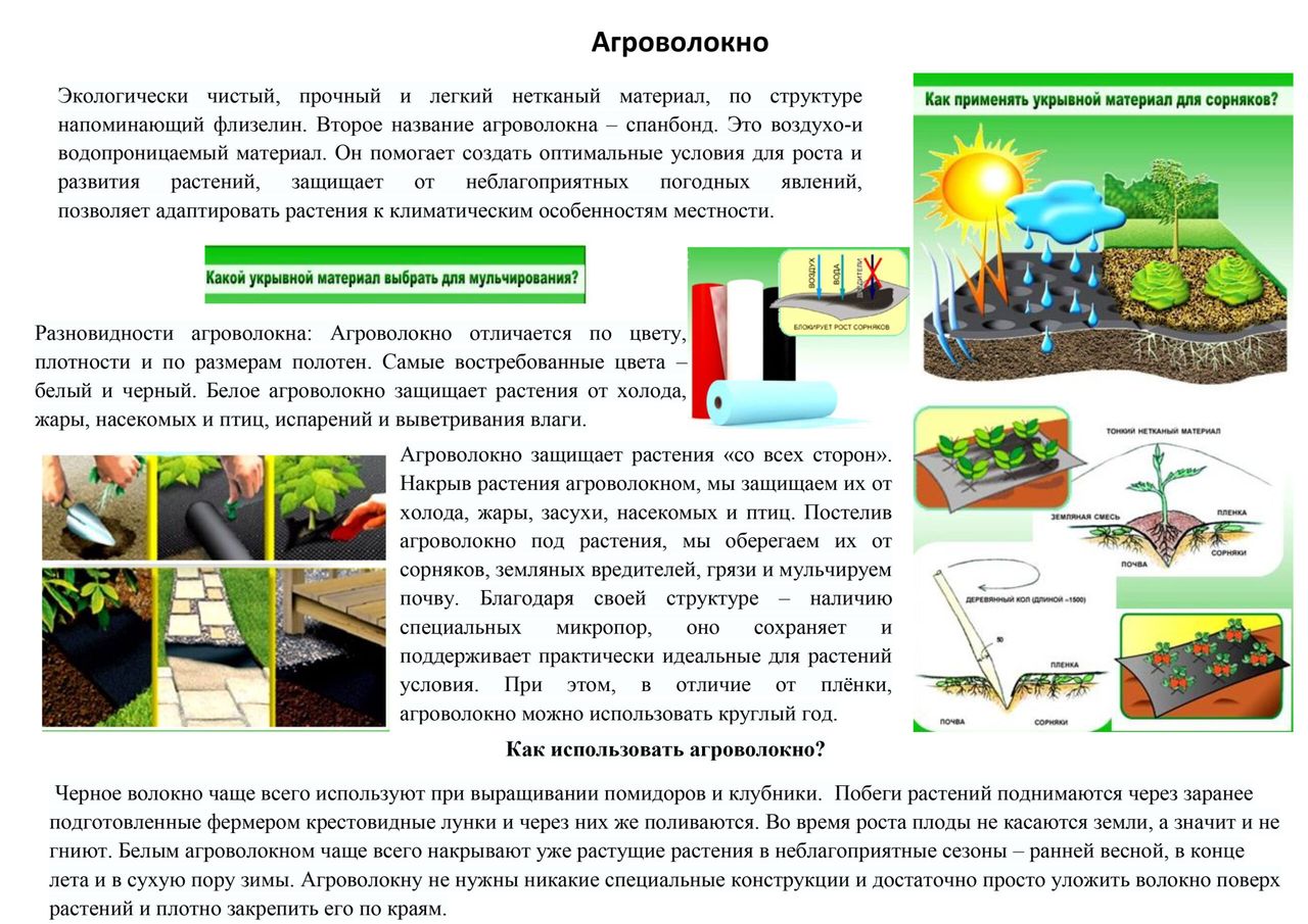 Агроволокно используется на учебно-опытном участке, где юннаты с преподавателями выращивают овощные культуры, ставят опыты, собирают и накапливают семенной материал. Весь этот участок покрыт агроволокном черного цвета. Биологический чистый материал способствует задержанию влаги, предохраняет почву от высыхания и эрозии, предотвращает рост сорняков. Поэтому нет необходимости ежедневно пропалывать, рыхлить и часто поливать грядки, а значит и экономить силы, время и воду.